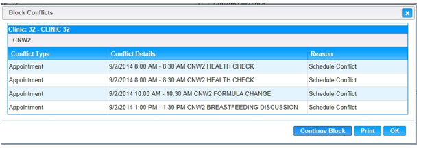 When a user on the Clinic Schedule Set Up page tries to block out a column that currently has appointments scheduled in it, the Block Conflicts Dialog Box will appear and let the user know there is a Schedule Conflict. The User has a choice to Cancel or Continue with the Block.
