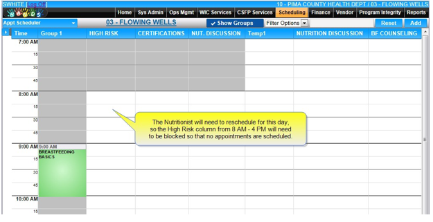 The WIC Nutritionist needs to reschedule for another day. Luckily, there are no appointments scheduled, and the high risk appointment column may be easily blocked.