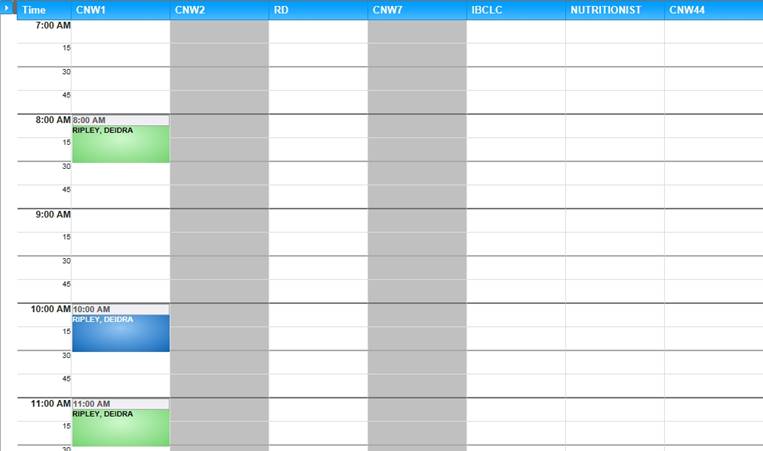 A special Appointment Time slot Template was created on the Maintain Templates Pages by the calendar builder. The new template will need to be applied to Clinic Scheduler by the calendar builder in order to change the column's hours. In this case, the employee needs to start at 10:00 AM while there is an appointment scheduled at 8 AM.