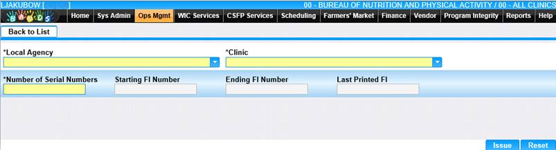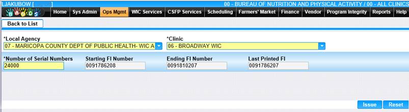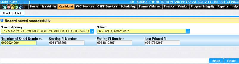 3. The page will display the FI information assigned to the selected clinic including: Number of Serial Numbers, Starting FI Number, Ending FI Number, and Last Printed FI.