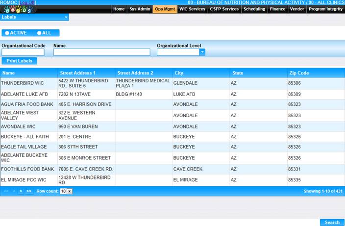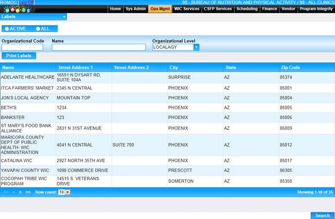 The Labels page will let the user search for organizations and print mailing labels for the search results. The user can search for State Agencies, Local Agencies, Clinics, Active organizations, or All organizations. The user also can search for an individual organization by entering the name in the Name field.