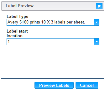 5. Select the appropriate Label Type and Label Start Location and click the Preview Labels button. The Label preview window will display.