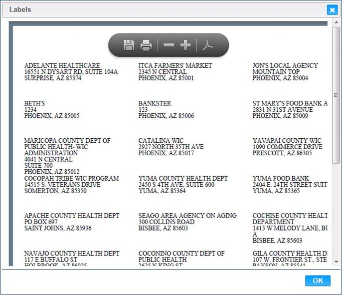 4. To print the label, click the Print Labels button located below the Organization Code search field. The Label Preview box will display.