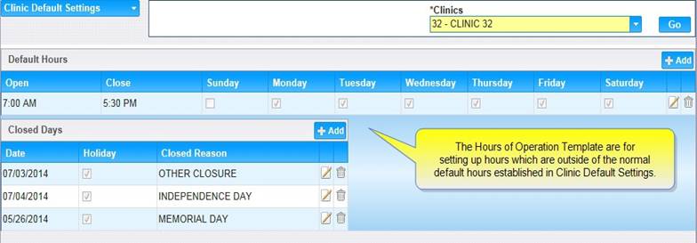 The Hours of Operation template is used to set the hours of operation outside of the Clinic Default Settings.