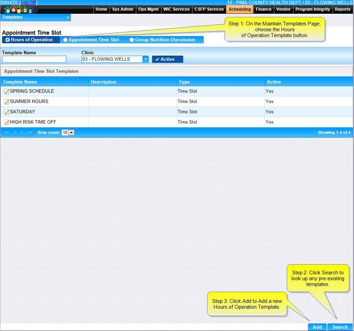 The WIC calendar builder will use the Hours of Operation page under the Maintain Templates area to add a special Hours of Operation Template. An Appointment Time Slot template will also need to be created to add appointment time slots during the newly extended time. Both templates will need to be saved in the Clinic Scheduler Set Up.