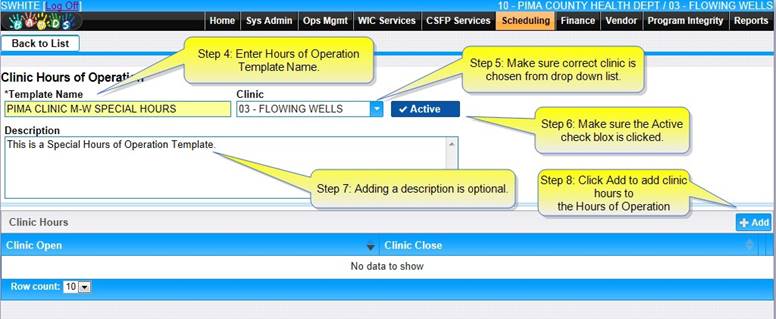 For example, the clinic default hour settings for a WIC Clinic might be from 8:00 am to 5:00 pm every day. If the clinic needed to stay open until 7:00 PM on a special day, an Hours of Operation template could be set up to allow the after regular hours extension.
