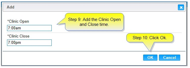 9. Select the start time and end time for the first Hours of Operation in the Clinic Open & Close fields.