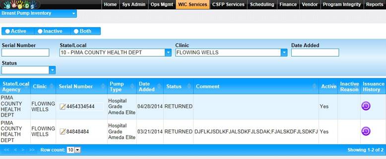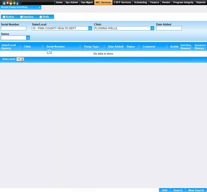 2. The Breast Pump Inventory search page displays.