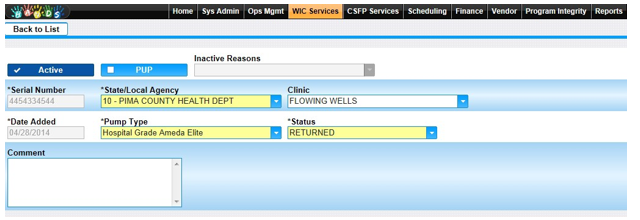 1. Select Breast Pump Inventory from the WIC Services navigation drop-down list. You will need to be in the WIC Services module to see this option.