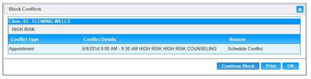If there is an appointment scheduled in the column to be blocked, HANDS will let you know by displaying the Block Conflicts box.
