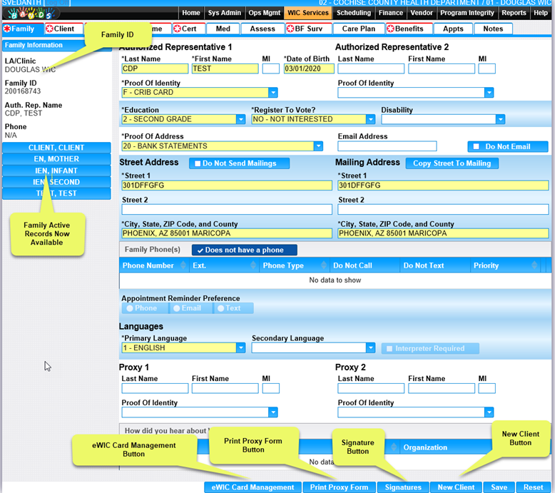 New Client - When clicked, brings the user to a new Client Information page for the addition of a new WIC Client record.