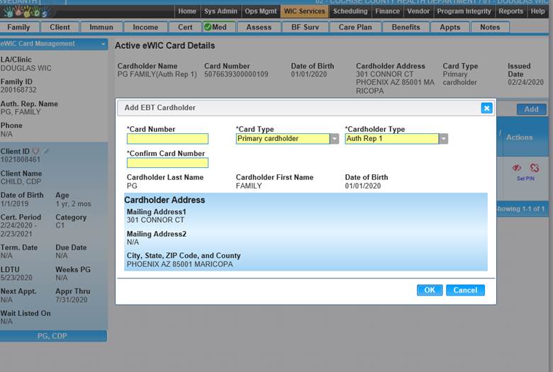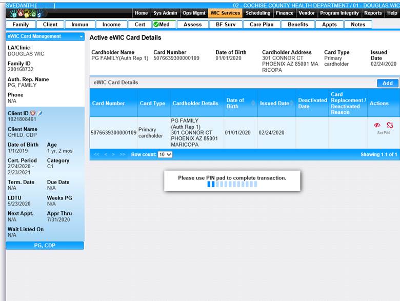 eWIC Card Management – this bottom navigates to the ‘Active eWIC Card Details’ page where user can add a eWIC card to the family. User can add card by clicking on ADD button shown below in the figure A Module 2. User can set a pin by clicking on set Pin option in the grid to the card as seen in Figure B Module2.